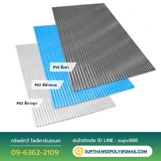 มองหาแผ่นหลังคาโพลีคาร์บอเนต ลูมิน่า แผ่นซุปเปอร์เวฟ ราคาถูก นนทบุรี สมุทรปราการ ลาดกระบัง แผ่นหลังคาโพลีคาร์บอเนตผลิตจากเนื้อโพลีคาร์บอเนต ความยืดหยุ่นสูง ดัดโค้งได้ง่าย, ป้องกันรังสีอุลตร้าไวโอเลต, สามารถให้แสงส่องผ่านได้ ในปริมาณความเข้มของสีที่เลือกใช้ ทนทุกสภาพอากาศ, ทนแรงกระแทกสูง ไม่เปราะแตกง่าย, น้ำหนักเบาติดตั้งง่าย, ทนความร้อนสูง ไม่ลามไฟ แผ่นหลังคาโพลีคาร์บอเนตตัน ลูมิน่า LUMINA Solid sheet กว้าง 1.22 เมตร, ยาว 2.44 เมตร หนา 2.0 มิล, 3.0 มิล, 4.0 มิล, 5.0 มิล, 6.0 มิล LUMINA Twinwall sheet ดัดโค้งได้ สีใส, สีขาว, สีชา, สีเทา, สีน้ำเงิน, สีฟ้า, สีเขียว, สีแดง, สีฟ้าทะเล, สีชมพู, สีส้ม, สีเหลือง, สีเงิน, สีทอง กว้าง 1.22 เมตร ยาว 2.44 เมตร หนา 2.0 มิล, 3.0 มิล, 4.0 มิล, 5.0 มิล, 6.0 มิล และขนาดกว้าง 2.10 เมตร ยาว 6.00 เมตร หนา 6 มิล, 8 มิล, 10 มิล แผ่นหลังคาโปร่งแสงโพลีคาร์บอเนตลอนเมทัลชีท LUMINA Metal Sheet ป้องกันแสง UV วัตถุดิบเกรด A สีขาวนม สีใส สีชา สีน้ำเงินใส สีเขียวใส กว้าง 0.81 เมตร ยาว 1.00 เมตร หนา 1.20 มิล